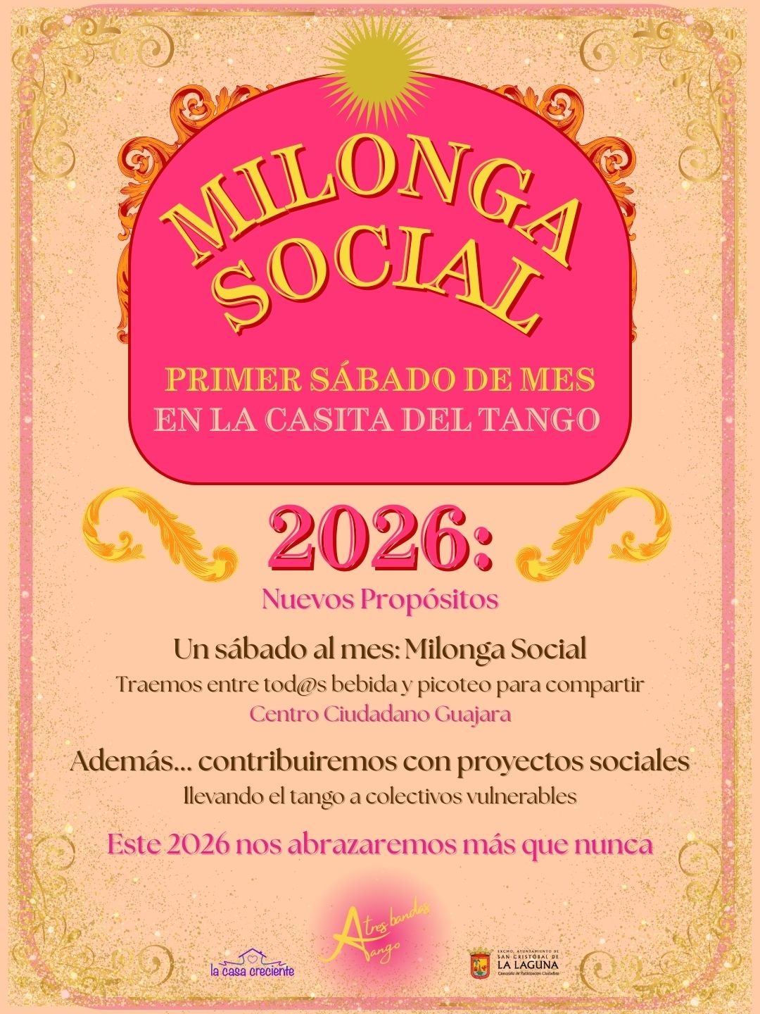 TANGO A TRES BANDAS Milongas, clases y prácticas de tango en Tenerife ¿Vives en Tenerife y quieres adentrarte en el universo del Tango? ¿Estás de paso y quieres conectar con el ambiente milonguero? ¿Te interesa aprender o practicar Tango? Éste es tu lugar. ¿BAILAMOS? Nuestras clases Ven a bailar a nuestra milonga en Tenerife La Casita del Tango primer sábado de cada mes, de 20.00 a 24.00 h Centro Ciudadano Guajara, calle Fraternidad 2 Guajara, La Laguna, Tenerife Clases grupales de tango para principiantes y nivel intermedio Clases nivel iniciación e intermedio Ven a practicar a «La Practiquita» más sobre las clases
